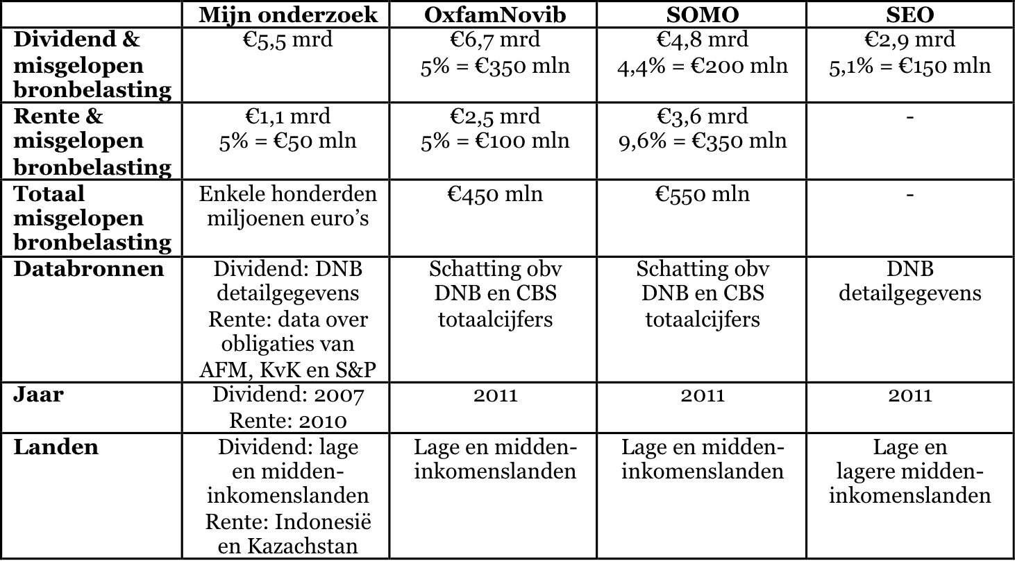 SEO komt tot veel lagere dividendstromen dan de andere studies. De reden is dat SEO hogere midden-inkomenslanden, zoals Thailand en Brazilië, niet meeneemt en de andere studies wel. De aannames van OxfamNovib, SOMO en SEO over het gemiddelde percentage misgelopen bronheffing zijn vrijwel gelijk, namelijk zo’n 5% van de dividenden. Dat lijkt een beetje aan de hoge kant, omdat je de bronheffing eigenlijk zou moeten vergelijken met het tarief onder andere verdragen in plaats van het standaardtarief zonder verdrag. Maar het geeft wel een indicatie.